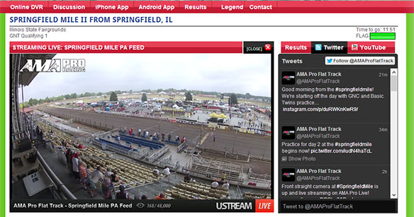 SPRINGFIELD, Ill. (September 1, 2013) - After capturing all of Saturday's AMA Pro Flat Track presented by J&P Cycles action, AMA Pro Live is up and running again today, streaming from multiple vantage points around the Springfield Mile. Fans that are unable to be in attendance for the final day of the Labor Day weekend doubleheader at the Illinois State Fairgrounds are encouraged to tune into AMA Pro Live to catch all of the action in real time. In addition to the intense racing action, defending Grand National Champion Jared Mees and his fiancée Nichole Cheza are scheduled to get married on the front straight of the Springfield Mile and the entire ceremony will be streamed live on AMA Pro Racing's live streaming website. The two Grand National Expert superstars will exchange vows on center stage at 1:30 p.m. ET/10:30 a.m. PT, just30 minutes before today's opening ceremonies. AMA Pro Live features live streaming video alongside timing and scoring, with play-by-play commentary provided by Barry Boone and Scottie Deubler, as well as AMA Pro Flat Track's Twitter feed. The newly added Discussion feature allows fans to join in on the conversation. For more information, log on and tune in at http://www.amaprolive.com/ft/. Now Streaming Live: Wedding, Opening Ceremonies and Main Event Starting Times: - Mees/Cheza Wedding Ceremony: 1:30 p.m. ET/10:30 a.m. ET